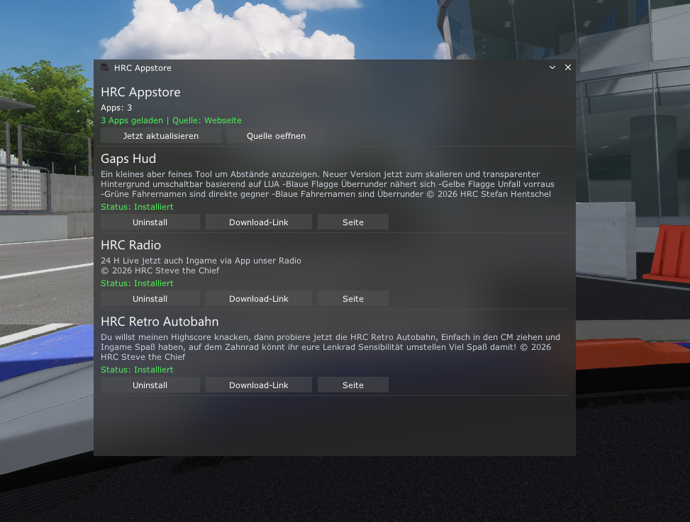 Der HRC Appstore ist deine zentrale Anlaufstelle für alle Tools und Erweiterungen der Hauptstadt Racer Community – direkt im Spiel.