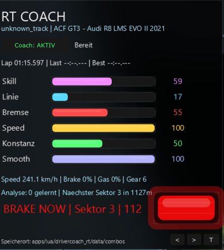 Ich habe die aktuelle Version des Driver Coach RT getestet und bin ehrlich gesagt ziemlich begeistert. Die App funktioniert als Realtime Driver Coaching Tool und hilft dir dabei, deine Rundenzeiten Schritt für Schritt zu verbessern – basierend auf deinem eigenen Fahrstil.